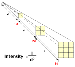 Intensity=1/d2, where d is the distance between the light source and the object.